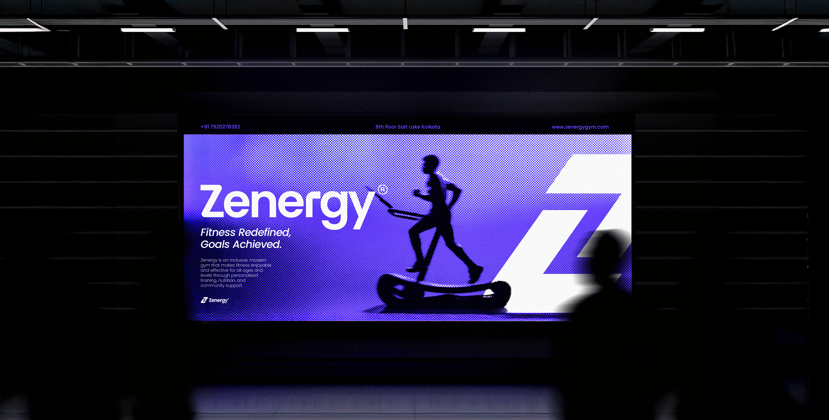 The “Z” in the Zenergy logomark combines motion and strength, with the top form suggesting a leg in stride to represent progress while the bottom resembles flexed arms conveying power and stability expressing determination toward fitness goals.
